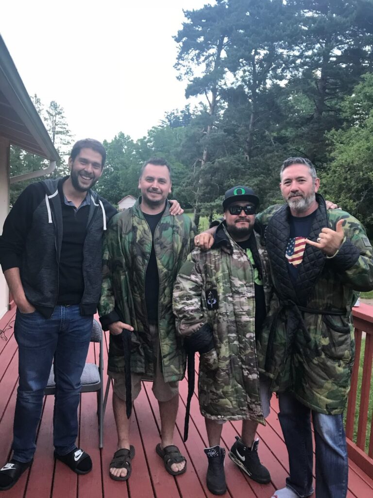 I figured this would be a great opportunity to send my buddy something that might help cheer him up during his treatment. I made the first prototype from a couple of old ‘woobies’ and the only commercial sewing pattern for a smoking jacket that I could find. Unfortunately, the dimensions of the largest size in the pattern were only big enough for a scrawny, man-bun-wearing coffee shop hipster. It was hardly big enough to fit a real man, let alone a warrior, so I had to get creative and modify everything. What I came up with was refined over time until its final design, which is what is currently available today.